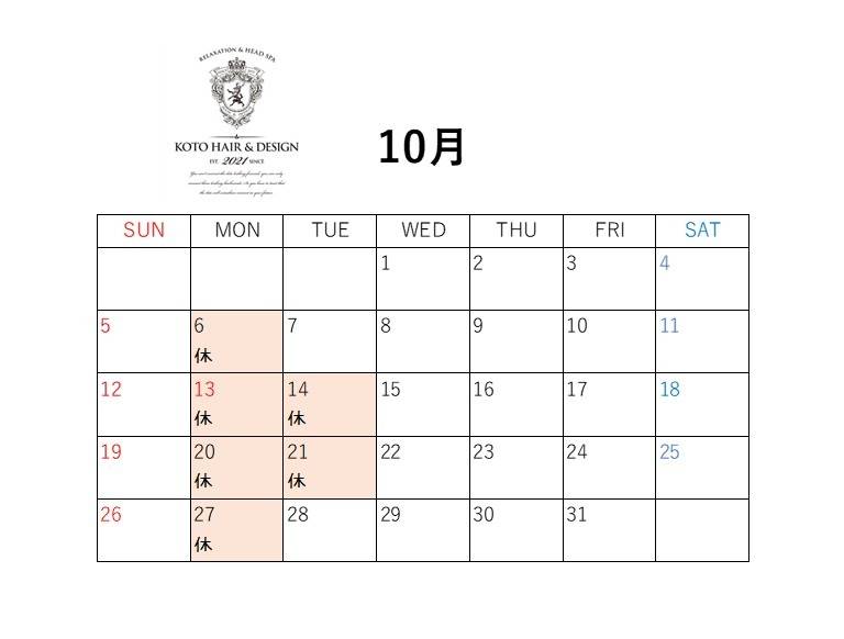 10月のお知らせ☆香芝市の美容室コトヘアーデザイン 2025/10/03 こんにちは!香芝市の美容室コトヘアーです😊 いつもご来店頂きありがとうございます(*^^*) 10月に入り、いつの間にか暑さが落ち着き過ごしやすくなってきましたね! お昼はまだまだ暑いので体調管理に気を付けてお過ごしください⭐ 10月のお休みは、通常通りの毎週月曜日と第2.3火曜日となっております。 今月もよろしくお願い致します♪